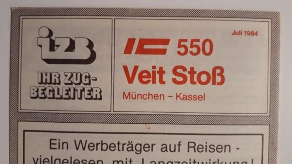 IZB IC 561 Prinzregent Frankfurt(M)-München Startseite Zuglaufschilder Besonderheiten Zugbegleiter Faltblatt vorhanden IZB IC 561 Prinzregent Frankfurt(M)-München Vorheriger Zuglaufschild IZB IC 562 Hans Sachs München-Nürnberg Nächster Zuglaufschild IZB IC 550 Veit Stoß München-Kassel