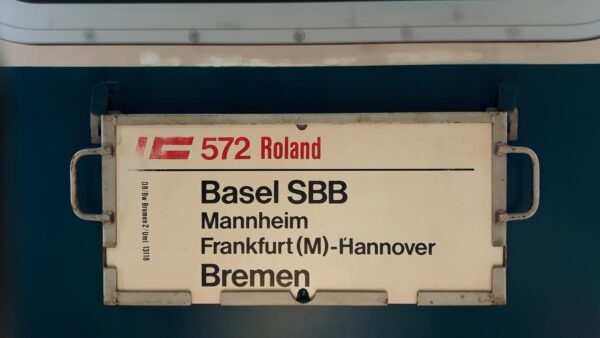 IC 573 Roland Bremen-Basel SBB Startseite Zuglaufschilder Fernverkehr InterCity IC 573 Roland Bremen-Basel SBB Das Betriebswerk Bremen 2 stellte 1984 diesen Zug. Vorheriger Zuglaufschild Bremen-Emden Nächster Zuglaufschild IC 128 Prinz Eugen Wien Westbahnhof-Frankurt(M)