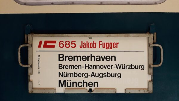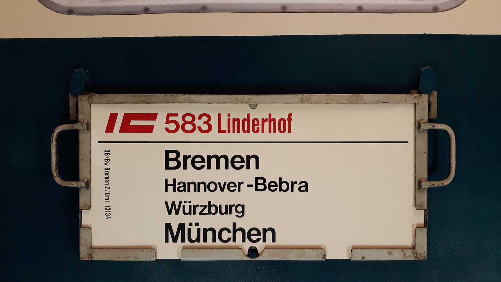 IC 583 Linderhof Bremen-München Startseite Zuglaufschilder Fernverkehr InterCity IC 583 Linderhof Bremen-München Bei diesem Zuglaufschild ist noch der Unterwegshalt Bebra aufgedruckt. Vorheriger Zuglaufschild IC 685 Jakob Fugger Bremerhaven-München Nächster Zuglaufschild IC 684 Linderhof München-Bremerhaven