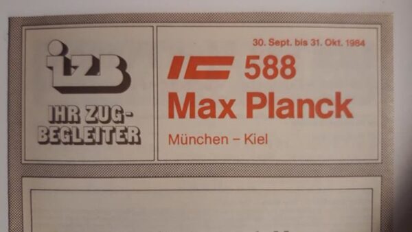 IZB IC 589 Hessen-Kurier Kassel-München Startseite Zuglaufschilder Besonderheiten Zugbegleiter Faltblatt vorhanden IZB IC 589 Hessen-Kurier Kassel-München Vorheriger Zuglaufschild IZB IC 589 Max Planck Kiel-München Nächster Zuglaufschild IZB IC 588 Max Planck München-Kiel