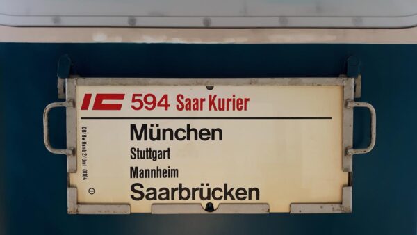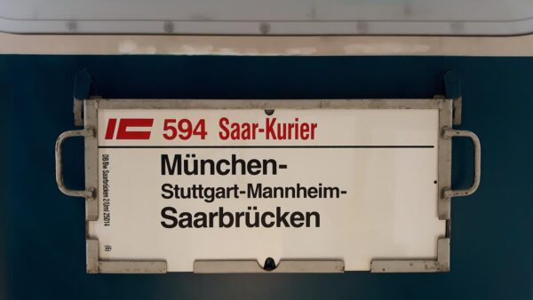 IC 594 Saar-Kurier München-Saarbrücken Startseite Zuglaufschilder Fernverkehr InterCity IC 594 Saar-Kurier München-Saarbrücken Das Schild ist vom Dreck;Wind und Wetter gezeichnet… Vorheriger Zuglaufschild IC 594 Saar-Kurier München Saarbrücken Nächster Zuglaufschild IC 594 Saar Kurier München-Saarbrücken
