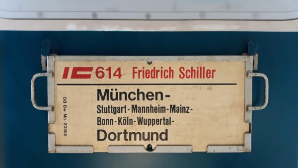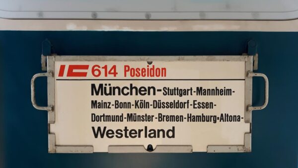 IC 614 Poseidon München-Hamburg=Altona Startseite Zuglaufschilder Fernverkehr InterCity IC 614 Poseidon München-Hamburg=Altona 1986 stellte das Betriebswerk Köln 5 diesen Zug. Vorheriger Zuglaufschild IC 614 Poseidon München-Westerland Nächster Zuglaufschild IC 614 Friedrich Schiller München-Dortmund