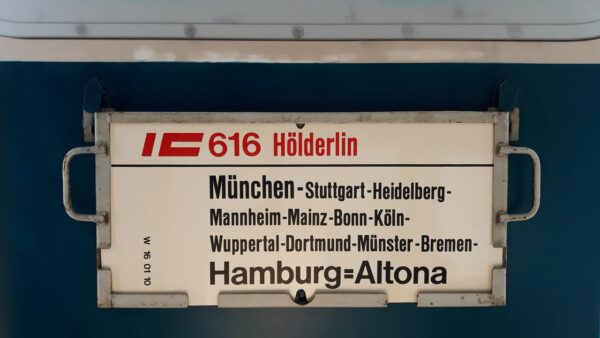 IC 616 Hölderlin Stuttgart-Dortmund Startseite Zuglaufschilder Fernverkehr InterCity IC 616 Hölderlin Stuttgart-Dortmund Gestellt vom Betriebswerk Stuttgart 2 1986. Vorheriger Zuglaufschild IC 616 Hölderlin Stuttgart-Hamburg=Altona Nächster Zuglaufschild IC 616 Hölderlin München-Hamburg=Altona