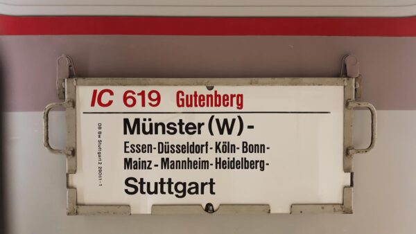 IC 618 Gutenberg Stuttgart-Münster(W) Startseite Zuglaufschilder Fernverkehr InterCity IC 618 Gutenberg Stuttgart-Münster(W) Nun mit neuem IC Logo ,stellte 1991 das Betriebswerk Stuttgart 2 diesen Zug. Vorheriger Zuglaufschild IC 615 Drachenfels Münster(W)-München Nächster Zuglaufschild IC 619 Gutenberg Münster-Stuttgart
