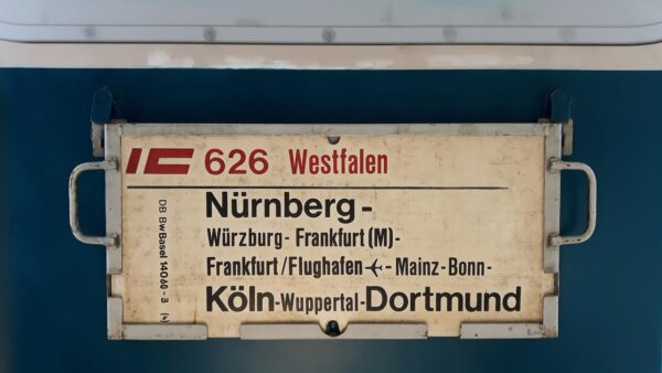 IC 626 Walhalla Regensburg-Hannover Startseite Zuglaufschilder Fernverkehr InterCity IC 626 Walhalla Regensburg-Hannover 1985 gestellt vom Betriebswerk Köln-Bbf. Vorheriger Zuglaufschild IC 626 Westfalen Nürnberg-Dortmund Nächster Zuglaufschild IC 626 Walhalla Nürnberg-Hannover