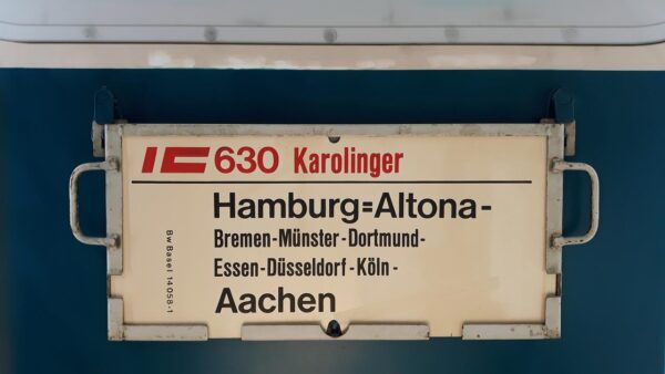 IC 630 Karolinger Hamburg=Altona-Aachen Startseite Zuglaufschilder Fernverkehr InterCity IC 630 Karolinger Hamburg=Altona-Aachen 1985 fuhr dieser Zug vom Hamburg über Köln nach Aachen. Vorheriger Zuglaufschild IC 632 Emil Nolde Berlin Hbf-Dagebüll Nächster Zuglaufschild IC 630 Karolinger Hamburg=Altona-Aachen