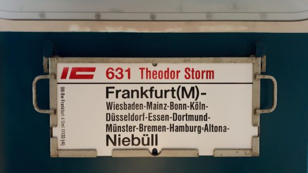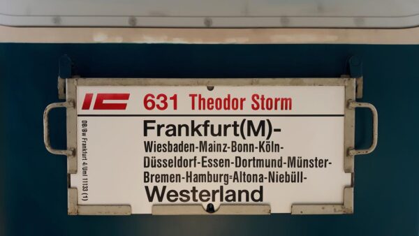 IC 631 Theodor Storm Wiesbaden-Westerland Startseite Zuglaufschilder Fernverkehr InterCity IC 631 Theodor Storm Wiesbaden-Westerland Dieser Waggon 1987 wurde erst beim Richtungswechsel in Wiesbaden angehängt. Vorheriger Zuglaufschild IC 631 Theodor Storm Frankfurt(M)-Niebüll Nächster Zuglaufschild IC 631 Theodor Storm Frankfurt(M)-Westerland