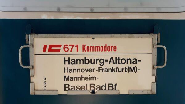 IC 633 Karolinger Aachen-Hamburg=Altona Startseite Zuglaufschilder Fernverkehr InterCity IC 633 Karolinger Aachen-Hamburg=Altona 1981 fuhr dieser Zug nur von Montag bis Samstag. Vorheriger Zuglaufschild IC 671 Kommodore Hamburg=Altona-Basel Bad Bf. Nächster Zuglaufschild IC 630 Theodor Storm Westerland-Frankfurt/M