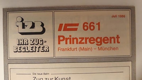 IZB IC 660 Prinzregent München-Frankfurt(M) Startseite Zuglaufschilder Besonderheiten Zugbegleiter Faltblatt vorhanden IZB IC 660 Prinzregent München-Frankfurt(M) Vorheriger Zuglaufschild IZB IC 661 Prinzregent Frankfurt(M)-München Nächster Zuglaufschild IZB IC 649 Wupper-Kurier Köln-Dortmund