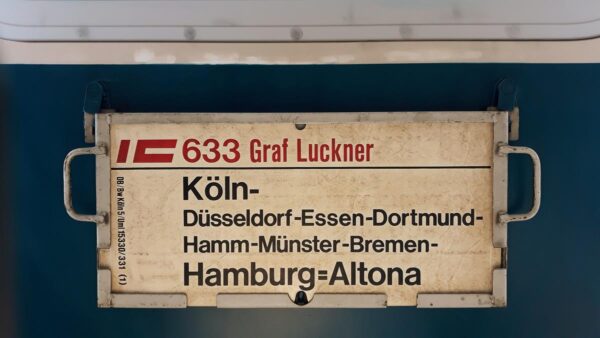 IC 682 Ernst Barlach München-Hamburg=Altona Startseite Zuglaufschilder Fernverkehr InterCity IC 682 Ernst Barlach München-Hamburg=Altona Das Betriebswerk Frankfurt 4 stellte diesen Zug. Vorheriger Zuglaufschild IC 633 Graf Luckner Köln-Hamburg=Altona Nächster Zuglaufschild IC 667 Meistersinger Dortmund-Nürnberg
