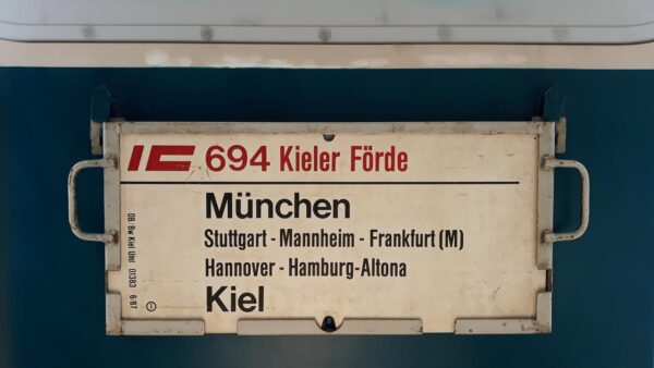 IC 695 Kieler Förde Kiel-München Startseite Zuglaufschilder Fernverkehr InterCity IC 695 Kieler Förde Kiel-München Das Schild ist vom Juni 1987. Vorheriger Zuglaufschild RB Erfurt-Heiligenstadt Nächster Zuglaufschild IC 694 Kieler Förde München-Kiel