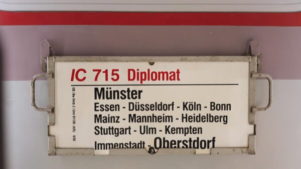 IC 714 Diplomat Oberstdorf-Münster Startseite Zuglaufschilder Fernverkehr InterCity IC 714 Diplomat Oberstdorf-Münster Dieses Schild des Zuges ,gestellt vom Betriebswerk Hamburg 2. Vorheriger Zuglaufschild InterRegio Kassel-Flensburg Nächster Zuglaufschild IC 715 Diplomat Münster-Oberstdorf