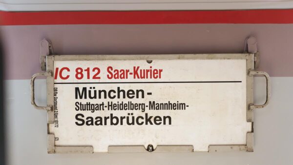 Dieses Zuglaufschild wurde im Fahrplanjahr 1991/1992 nur für den Wagen 43 an Sonntagen gedruckt,denn der Wagen wurde erst in Ulm an den Hauptzug angehängt und der Zug endete nur am Sonntag bereits in Münster.