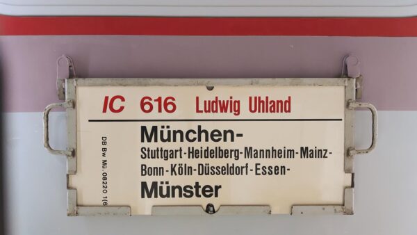 IC 617 Ludwig Uhland Dortmund-München Startseite Zuglaufschilder Fernverkehr InterCity IC 617 Ludwig Uhland Dortmund-München 1991 startete dieser Zug um 14.11 Uhr in Dortmund… Vorheriger Zuglaufschild IC 619 Gutenberg Münster-Stuttgart Nächster Zuglaufschild IC 616 Ludwig Uhland München-Münster