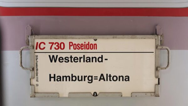 IC 731 Poseidon Hamburg-Altona-Westerland Startseite Zuglaufschilder Fernverkehr InterCity IC 731 Poseidon Hamburg-Altona-Westerland Der Zug startete 1990 als Frühberbindung um 7.08 Uhr in Hamburg-Altona. Vorheriger Zuglaufschild IC 730 Poseidon Westerland-Hamburg=Altona Nächster Zuglaufschild Aschaffenburg Hbf