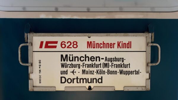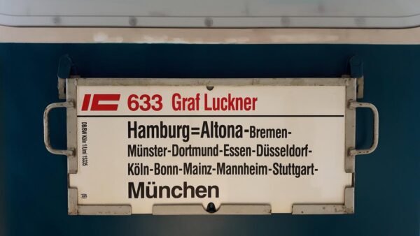 Dieses Zuglaufschild muss ein Druckfehler sein,der IC 819 fuhr 1989 von Hamburg-Altona nach München.Der Zug müsste IC 818 Heinich Heine heissen.Der IC 818 Heinrich Heine fuhr in seiner Gesamtheit 1989 von München nach Hamburg, nur Dienstag bis Donnerstag und begann seine Fahrt erst in Stuttgart und am Sonntag (daher dieses Schild,trotz Schreibfehler) seine Fahrt erst in Köln.
