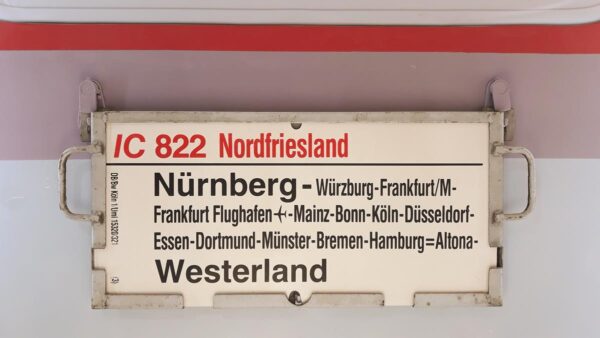 Der Wagenteil ist der umsteigefreie Zugteil von Regensburg nach Dagebüll. Der andere Zugteil des IC 822 Nordfriesland fährt ab Niebüll weiter nach Sylt. Auch dieses Schild ist in dieser Sammlung vorhanden. Einfach unter Suche IC 822 Nordfriesland eingeben,dann kommen drei Schilder,der eine Zug beginnt seine Reise erst in Nürnberg. Bedeutet nur von Nürnberg bis Niebüll fährt der Zug in seiner vollen Länge..