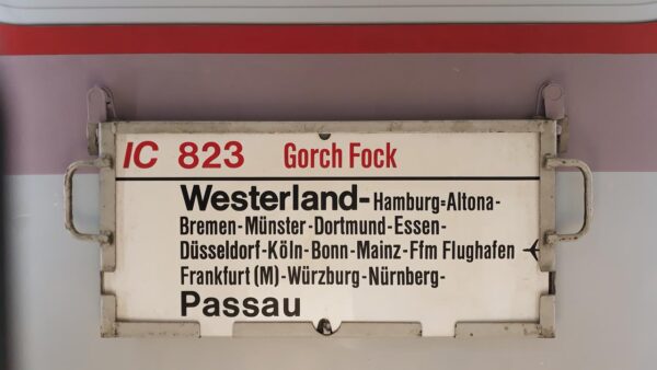 Druckfehler oder eine geheime Botschaft,warum hinter dem Zielbahnhof „Passau“ bei diesem Zuglaufschild ein Bindestrich aufgedruckt ist.