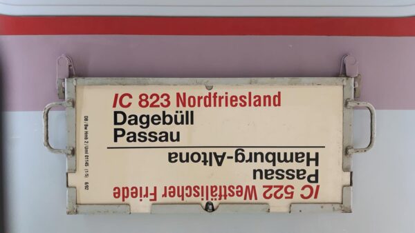 Mit diesem Schild kann man den Vergleich machen, einfach unter der Suchfunktion, diesen Zug mit IC 823 Nordfriesland suchen, dann kommen zwei Schilder dieses Zuglaufes ,einmal von Wind und Wetter gezeichnet und einmal wie neu . Da kann man sehen was, Wind und Wetter ausmachen…