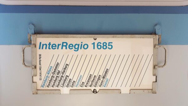 Dieses Zuglaufschild hatte einen schlimmen Druckfehler und wurde hoffentlich nicht oder nicht lange benutzt,denn man könnte hier meinen der Zug würde den Zwischenhalt Göttingen zweimal anfahren.