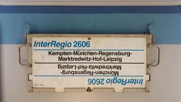 InterRegio 2606 München-Leipzig Startseite Zuglaufschilder Fernverkehr InterRegio-Züge InterRegio 2606 München-Leipzig Dieser Zug wurde vom Betriebswerk Leipzig gestellt. Vorheriger Zuglaufschild InterRegio Murgtal Bad Wildbad-Emden Nächster Zuglaufschild InterRegio 2606 Kempten-Leipzig