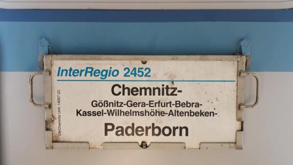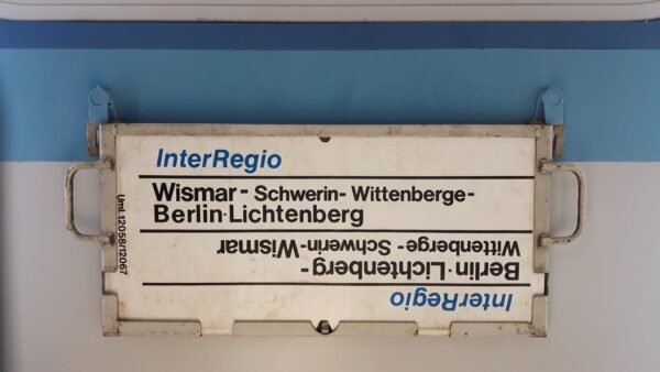InterRegio Cottbus-Lübeck Startseite Zuglaufschilder Fernverkehr InterRegio-Züge InterRegio Cottbus-Lübeck Wind und Wetter haben das Schild des Betriebswerkes Dresden dreckig werden lassen. Vorheriger Zuglaufschild IC 681 Nordwind Bremen-München Nächster Zuglaufschild IC 681 Veit Stoß Hamburg=Altona-München