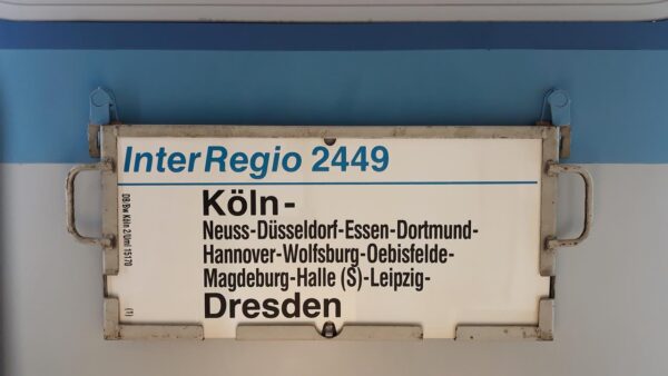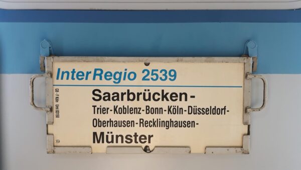 InterRegio 2536 Cuxhaven-Saarbrücken Startseite Zuglaufschilder Fernverkehr InterRegio-Züge InterRegio 2536 Cuxhaven-Saarbrücken Ein Schild des Betriebswerkes Köln-Es ist ein Schild des IR 2536 Vorheriger Zuglaufschild InterRegio 2539 Saarbrücken-Münster Nächster Zuglaufschild InterRegio 2449 Köln-Dresden
