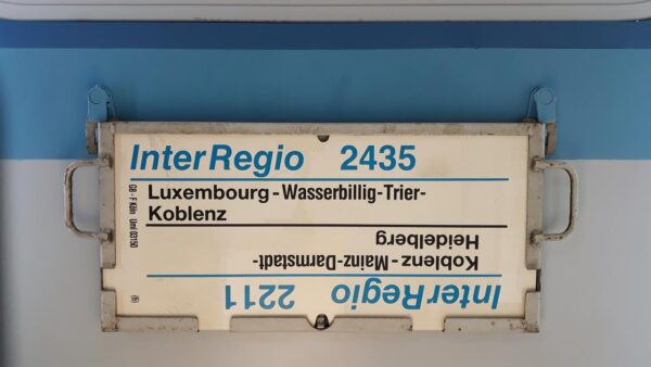 InterRegio 2449 Köln-Dresden Startseite Zuglaufschilder Fernverkehr InterRegio-Züge InterRegio 2449 Köln-Dresden Ein Schild des Betriebswerkes Köln-Es ist ein Schild des IR 2449 Vorheriger Zuglaufschild InterRegio 2536 Cuxhaven-Saarbrücken Nächster Zuglaufschild InterRegio 2435 Luxembourg-Koblenz