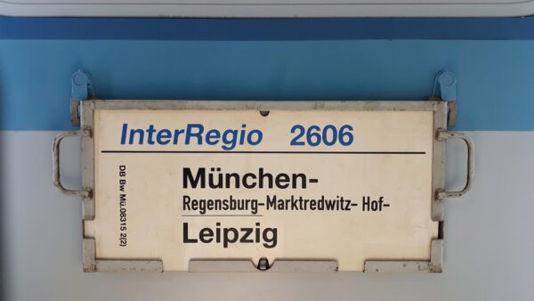 Ein Schild des Betriebswerkes München-Es ist ein Schild des IR 2607- Regensburg ist unterstrichen, weil dort der Wagen die Richtung wechselt.