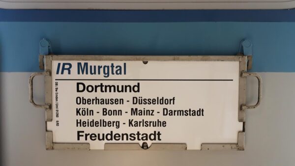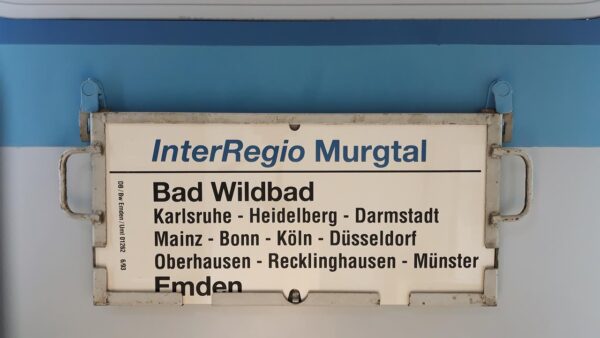 InterRegio Murgtal Dortmund-Bad Wildbad Startseite Zuglaufschilder Fernverkehr InterRegio-Züge InterRegio Murgtal Dortmund-Bad Wildbad Hier ein klassischer Siebruckfehler,der Zielbahnhof ist schlecht zu lesen. Vorheriger Zuglaufschild InterRegio Murgtal Dortmund-Freudenstadt Nächster Zuglaufschild InterRegio Murgtal Bad Wildbad-Emden