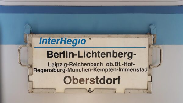 InterRegio Oberstdorf-Berlin-Lichtenberg Startseite Zuglaufschilder Fernverkehr InterRegio-Züge InterRegio Oberstdorf-Berlin-Lichtenberg Gestellt vom Reichsbahn -Betriebswerk Dreseden. Vorheriger Zuglaufschild InterRegio Konstanz-Karlsruhe Nächster Zuglaufschild InterRegio Berlin-Lichtenberg-Oberstdorf