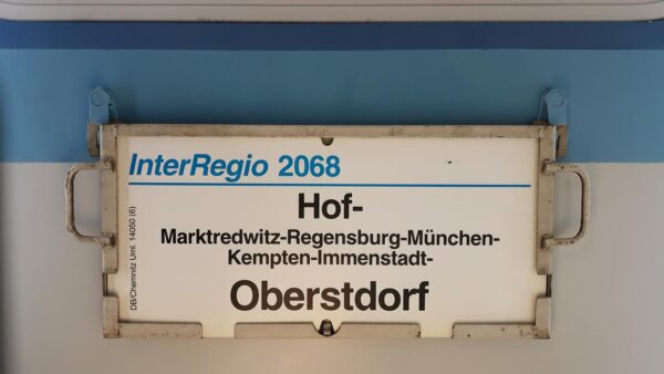 InterRegio 2069 Oberstdorf-Hof Startseite Zuglaufschilder Fernverkehr InterRegio-Züge InterRegio 2069 Oberstdorf-Hof Ein Schild des Betriebswerkes Chemnitz -Es ist ein Schild des IR 2069 Vorheriger Zuglaufschild InterRegio 2132 Berlin-Lichtenberg-Lübeck Nächster Zuglaufschild InterRegio 2068 Hof-Oberstdorf