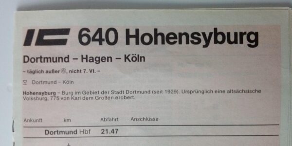 IZB IC 642 Gürzenich Dortmund-Köln Startseite Zuglaufschilder Besonderheiten Zugbegleiter Faltblatt vorhanden IZB IC 642 Gürzenich Dortmund-Köln Vorheriger Zuglaufschild IZB IC 640 Hohensyburg Dortmund-Köln Nächster Zuglaufschild IZB IC 644 Bergisches Land Dortmund-Köln