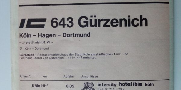 IZB IC 645 Bergisches Land Köln-Dortmund Startseite Zuglaufschilder Besonderheiten Zugbegleiter Faltblatt vorhanden IZB IC 645 Bergisches Land Köln-Dortmund Vorheriger Zuglaufschild IZB 541 Lenne-Kurier Köln-Dortmund Nächster Zuglaufschild IZB IC 643 Gürzenich Köln-Dortmund