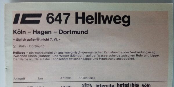 IZB IC 649 Wupper-Kurier Köln-Dortmund Startseite Zuglaufschilder Besonderheiten Zugbegleiter Faltblatt vorhanden IZB IC 649 Wupper-Kurier Köln-Dortmund Vorheriger Zuglaufschild Dolomiten-Express Lichtenfels-Bolzano/Bozen Nächster Zuglaufschild IZB IC 647 Hellweg Köln-Dortmund