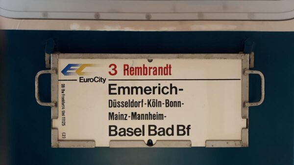 Dieser Wagen fuhr von Köln nach Emmerich,wo er an den aus Amsterdam kommenden EuroCity 3 „Rembrandt“ anhängt wurde.Die Rückseite dieses Zuglauschildes ist dem EC 3 von Emmerich nach Basel Bad Bf bedruckt.