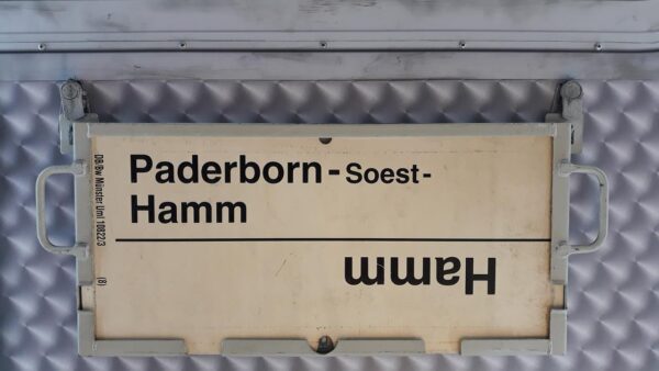 Ein Zuglaufschild mit vier Zielen,zwei Zielen auf jeder Seite.