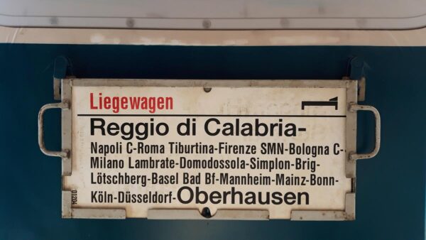 Liegewagen Oberhausen-Reggio di Calabria Startseite Zuglaufschilder Fernverkehr Schlaf-und Liegewagen Liegewagen Oberhausen-Reggio di Calabria Diesen D-Zug 2105 stellte das Betriebswerk Mönchengladbach. Vorheriger Zuglaufschild Liegewagen Reggio di Calabria-Oberhausen Nächster Zuglaufschild Schlafwagen Agrigento-Stuttgart