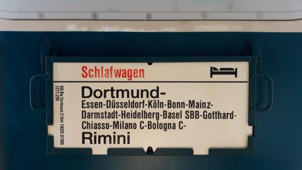 Nächster Zuglaufschild Schlafwagen Dortmund-Rimini