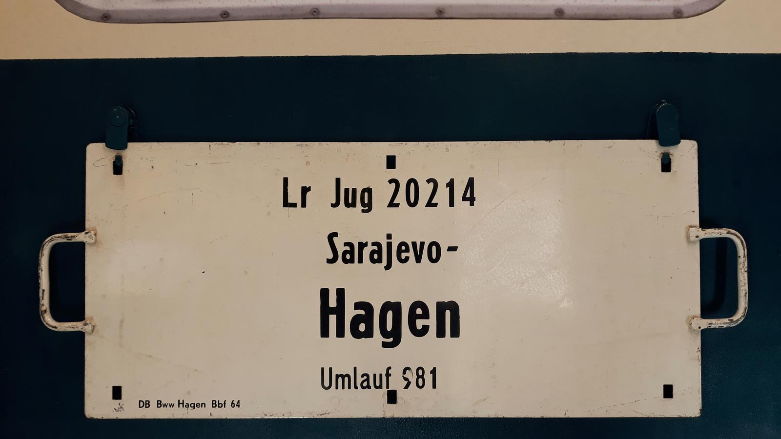 Lr Jug 20214 Sarajevo-Hagen Startseite Zuglaufschilder Fernverkehr D-Züge lange Strecke Lr Jug 20214 Sarajevo-Hagen Das Bww Hagen stellte diesen Gastarbeiterzug nach Hagen in Westfalen. Vorheriger Zuglaufschild D Esp 20313 Friedberg/H-Lisboa Nächster Zuglaufschild Lr Jug 20215 Donauwörth-Sarajevo