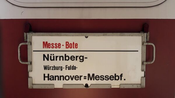 Messe-Bote Hannover=Messebf.-Nürnberg Startseite Zuglaufschilder Fernverkehr Messezüge Messe-Bote Hannover=Messebf.-Nürnberg Ein Messezug,gestellt vom Betriebswerk Nürnberg. Vorheriger Zuglaufschild Messe-Bote Nürnberg-Hannover=Messebf. Nächster Zuglaufschild IC 598 Ludwig Uhland München-Hamburg=Altona