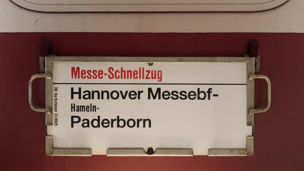 Messe-Schnellzug Paderborn-Hannover Messebf Startseite Zuglaufschilder Fernverkehr Messezüge Messe-Schnellzug Paderborn-Hannover Messebf Das Betriebswerk Dortmund 2 stellte diesen D-Zug 1829 nach Hannover. Vorheriger Zuglaufschild Messe-Schnellzug Hannover Messebf-Paderborn Nächster Zuglaufschild Memmingen-Leutkirch