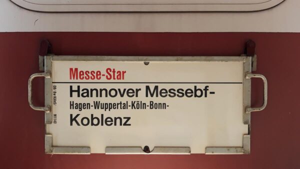 Messe-Star Koblenz-Hannover Messebahnhof Startseite Zuglaufschilder Fernverkehr Messezüge Messe-Star Koblenz-Hannover Messebahnhof Das Betriebswerk Köln 5 stellte diesen Messezug als M 1142 Vorheriger Zuglaufschild Messer-Star Hannover Messebahnhof-Koblenz Nächster Zuglaufschild Lemgo-Bielefeld