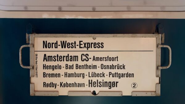 Der Wagen der 1987 dieses Zuglaufschild führte,wurde erst ist in Helsingør an den aus Stockholm kommenden Zug angehängt,daher hielt der der Zug in Helsingør auch 20.55 Uhr bis 21.09 Uhr und fuhr dann weiter in die Niederlande. Der Hauptzug fuhr ab Utrecht weiter nach Hoek van Holland,dieser Wagen ab Utrecht weiter nach Amsterdam CS.