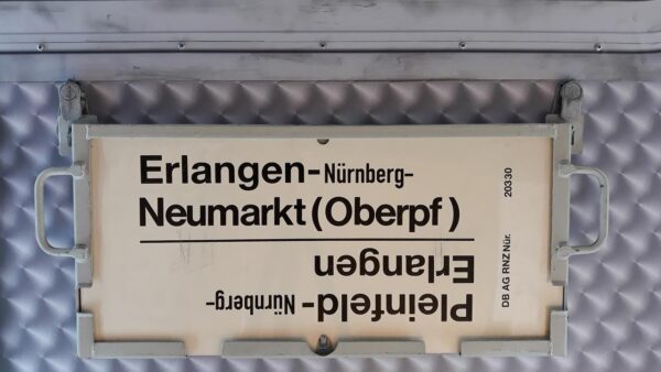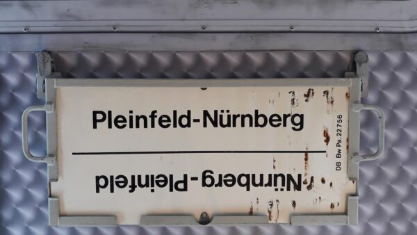 Nürnberg-Pleinfeld Startseite Zuglaufschilder Nahverkehr Nahverkehrszüge Nürnberg-Pleinfeld Ein Zuglaufschild für eine 49 km lange Strecke. Vorheriger Zuglaufschild Nürnberg Hbf Nächster Zuglaufschild Dampf-Sonderzug Kölner-Eisenbahn-Club Nürnberg-Gunzenhausen-Nördlingen