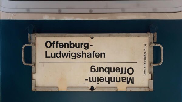 Offenburg-Heidelberg Startseite Zuglaufschilder Nahverkehr Vier Ziele auf einem Schild Offenburg-Heidelberg Das Betriebswerk Freiburg stellte diesen Zug. Vorheriger Zuglaufschild Offenburg-Ludwigshafen Nächster Zuglaufschild Karlsruhe-Ludwigshafen