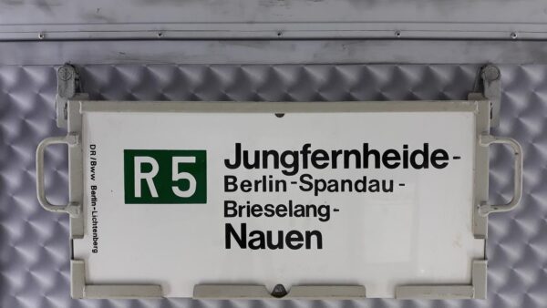 R 5 Nauen-Jungfernheide Startseite Zuglaufschilder Nahverkehr Nahverkehrszüge R 5 Nauen-Jungfernheide Ein Schild der Deutschen Reichsbahn. Vorheriger Zuglaufschild Walldürn-Osterburken Nächster Zuglaufschild R 5 Jungfernheide-Nauen