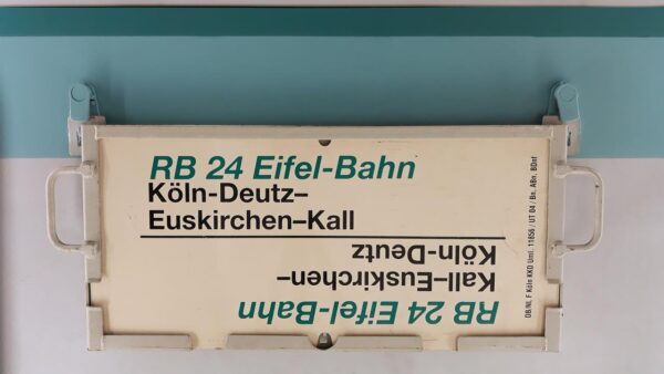 RB 24 Eifel-Bahn Gerolstein-Köln-Deutz Startseite Zuglaufschilder Nahverkehr RegionalBahn RB 24 Eifel-Bahn Gerolstein-Köln-Deutz Vorheriger Zuglaufschild RB 24 Eifel-Bahn Köln-Deutz-Kall Nächster Zuglaufschild RB 24 Berlin-Schöneweide-Elsterwerda
