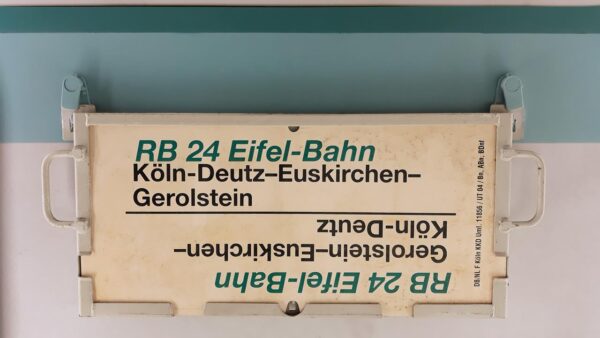 RB 24 Eifel-Bahn-Kall-Köln-Deutz Startseite Zuglaufschilder Nahverkehr RegionalBahn RB 24 Eifel-Bahn-Kall-Köln-Deutz Vorheriger Zuglaufschild RB 25 Elsterwerde-Berlin Schöneweide Nächster Zuglaufschild RB 24 Eifel-Bahn Köln-Deutz-Gerolstein