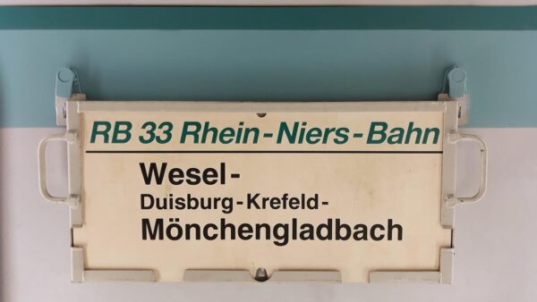 RB 33 Rhein-Niers-Bahn Mönchengladbach-Wesel Startseite Zuglaufschilder Nahverkehr RegionalBahn RB 33 Rhein-Niers-Bahn Mönchengladbach-Wesel Vorheriger Zuglaufschild RB 33 Rhein-Niers-Bahn Wesel-Mönchengladbach Nächster Zuglaufschild RB 33 Jüterbog-Potsdam Pirschheide